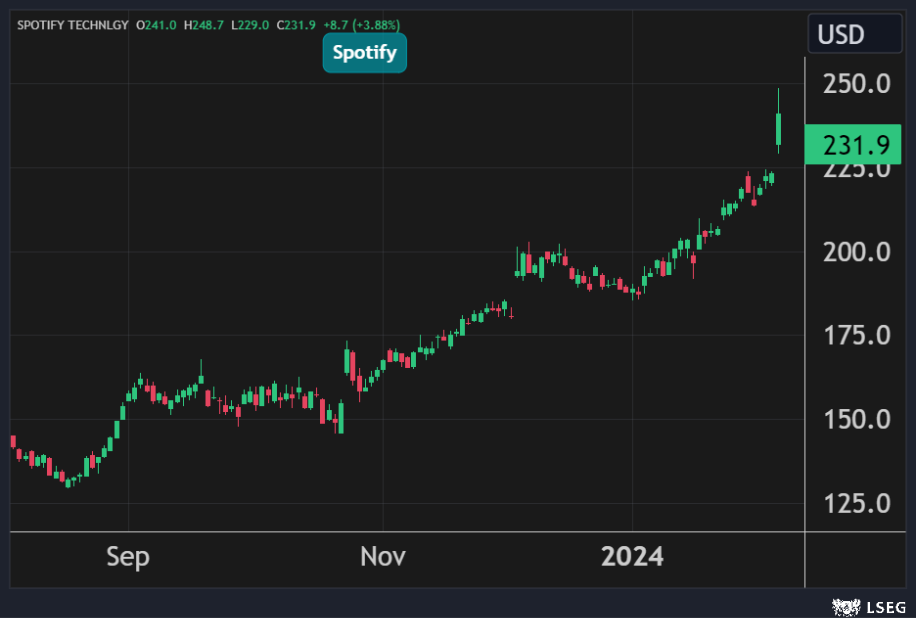 ارتفع سهم Spotify بنسبة 4% في جلسة الثلاثاء إلى أعلى مستوياته في أكثر من عامين، لتضيف الشركة 1.7 مليار دولار إلى قيمتها السوقية في يوم واحد.