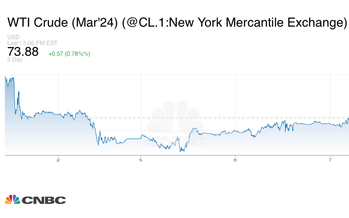 وارتفعت العقود الآجلة لخام تكساس الأميركي 55 سنتاً أو 0.75% لتبلغ عند التسوية 73.86 دولار للبرميل