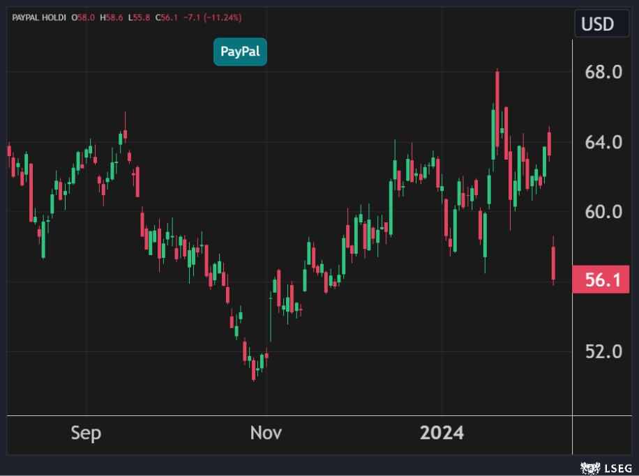 هبط سهم PayPal بنسبة 11% في جلسة الخميس ليتكبد أكبر خسارة يومية له في 6 أشهر.