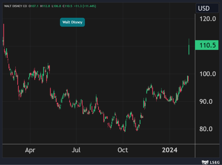 قفز سهم Disney بنسبة 11% في جلسة الخميس محققاً أعلى مكاسب يومية في أكثر من 3 سنوات، لتضيف الشركة 21 مليار دولار إلى قيمتها السوقية في يوم واحد.