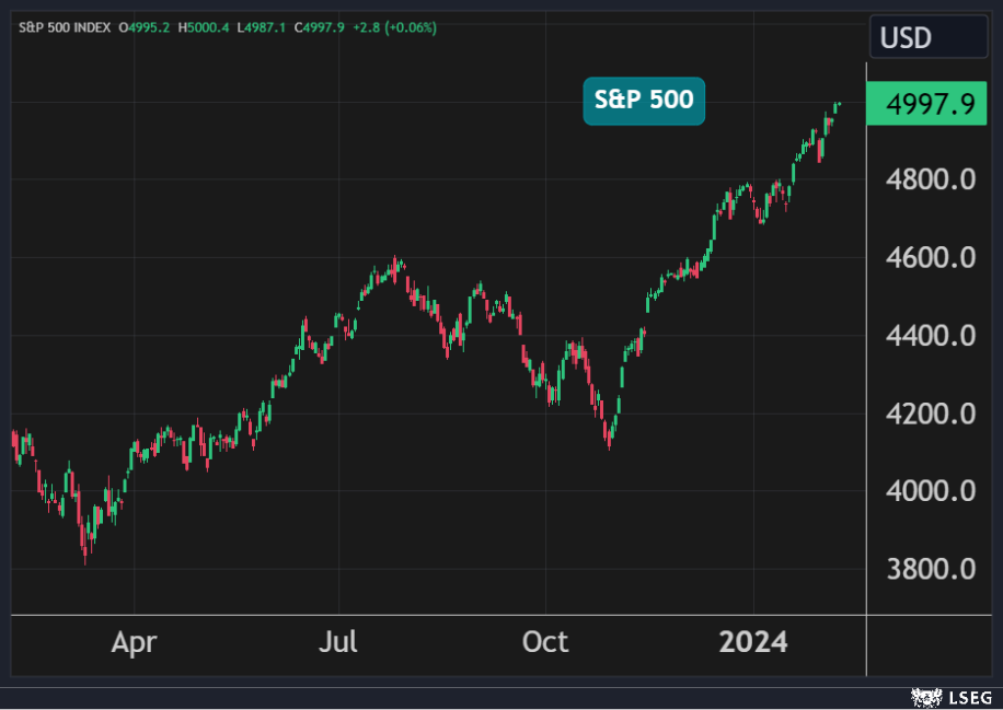 كما ارتفع مؤشر S&P 500 بنسبة 0.06% ، واستطاع خلال الجلسة ملامسة مستويات 5000 نقطة للمرة الأولى له على الإطلاق قبل أن يغلق عند مستويات 4998 نقطة.