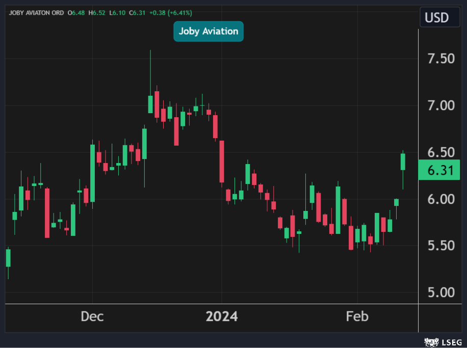 ارتفع سهم Joby بنسبة 6% في جلسة الإثنين مسجلاً أعلى إغلاق له منذ بداية العام الحالي.