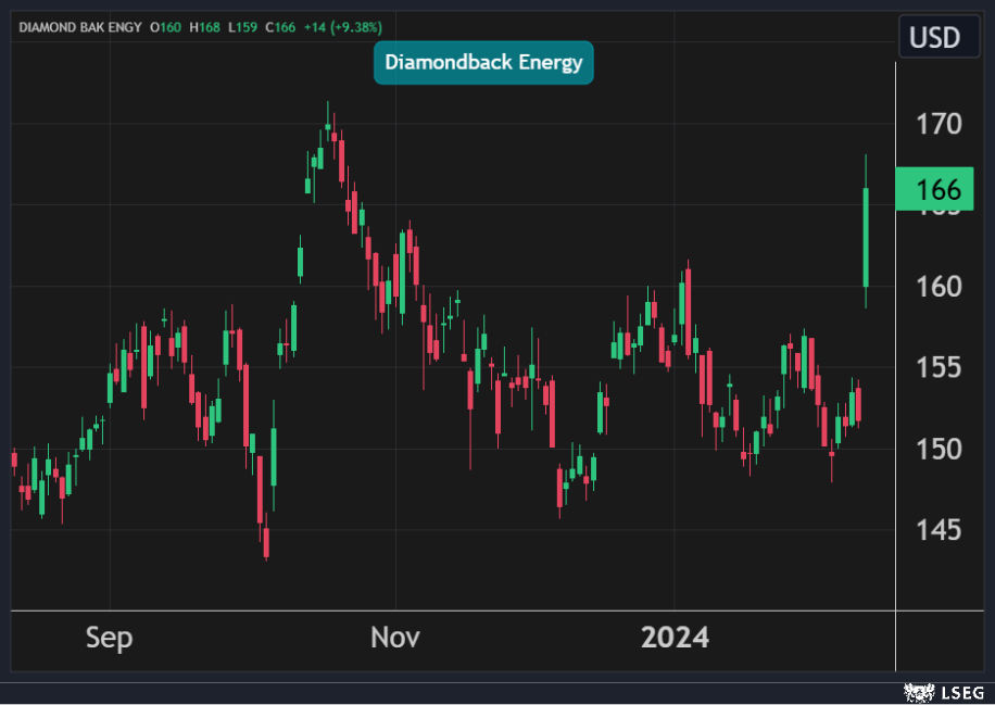 قفز سهمDiamondback بنسبة 9% في جلسة الإثنين محققاً أعلى مكاسب يومية في نحو 3 سنوات، لتضيف الشركة 2.5 مليار دولار إلى قيمتها السوقية في يوم واحد.