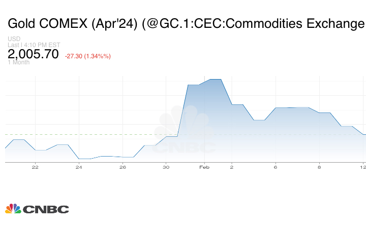 وانخفض الذهب في المعاملات الفورية 1.3% إلى 1992.5042 دولار للأونصة، وهو أدنى مستوياته منذ 13 ديسمبر/ كانون الأول. كما نزلت العقود الأميركية الآجلة للذهب 1.3% إلى 2005.60 دولار.