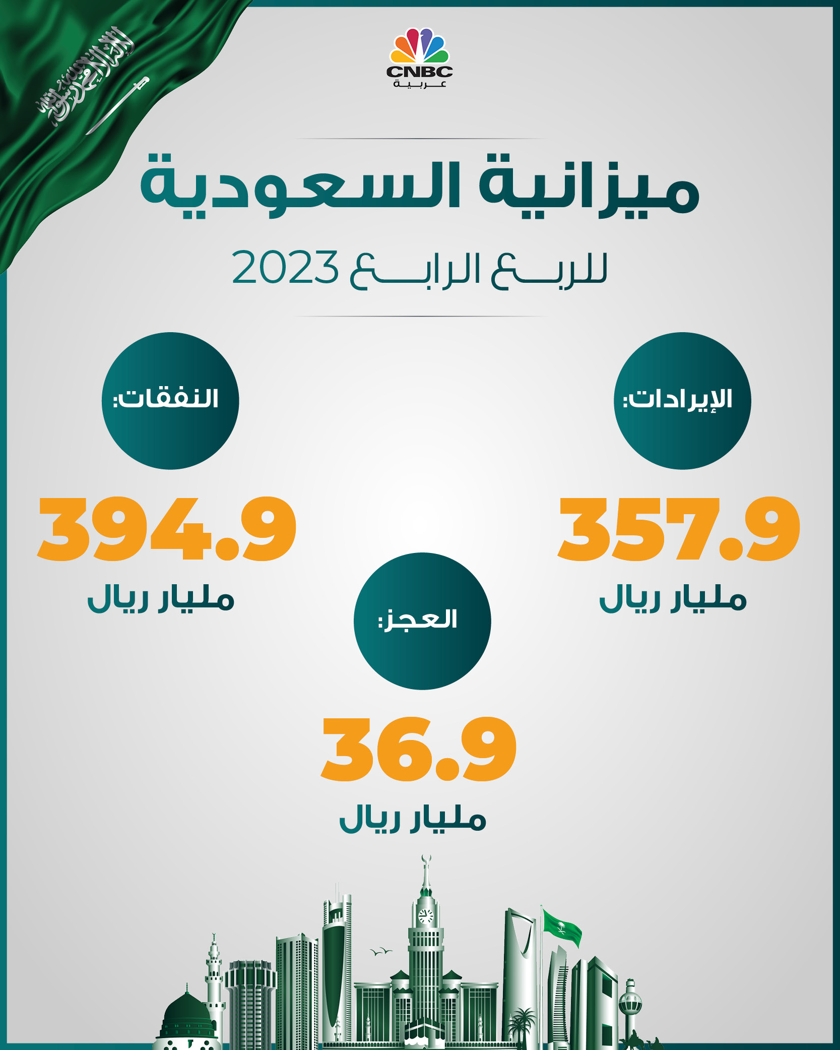 سجلت ميزانية السعودية خلال الربع الرابع من العام 2023 عجزاً بـ 36.9 مليار ريال، مع تسجيلها لإيرادات بـ 357.9 مليار ريال، ونفقات بـ 394.9 مليار ريال.