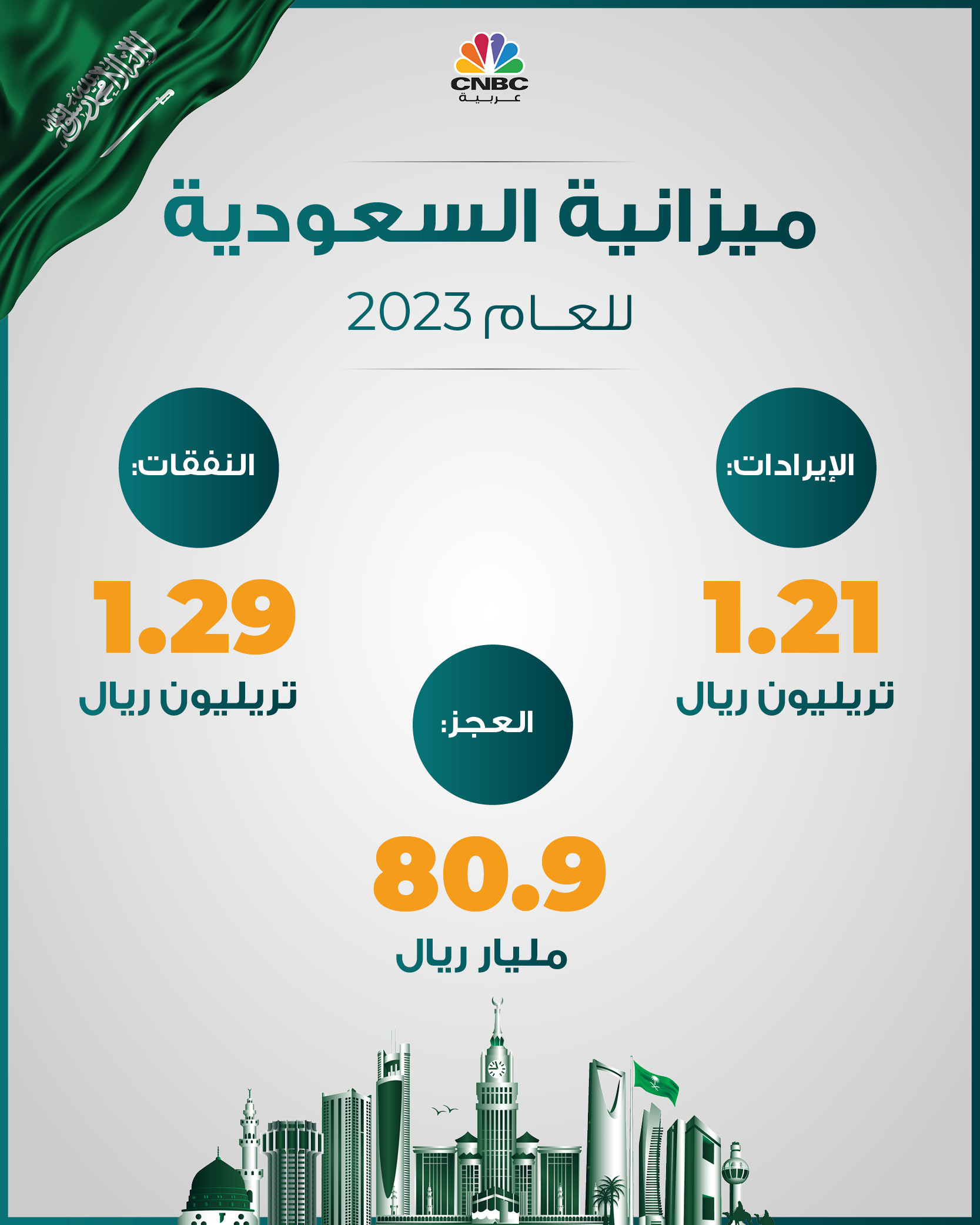 وبالحديث عام 2023 ككل، فقد سجلت الميزانية عجزاً بـ 80.9 مليار ريال، مع تسجيل إيرادات بـ 1.21 تريليون ريال، ونفقات بـ 1.29 تريليون ريال.