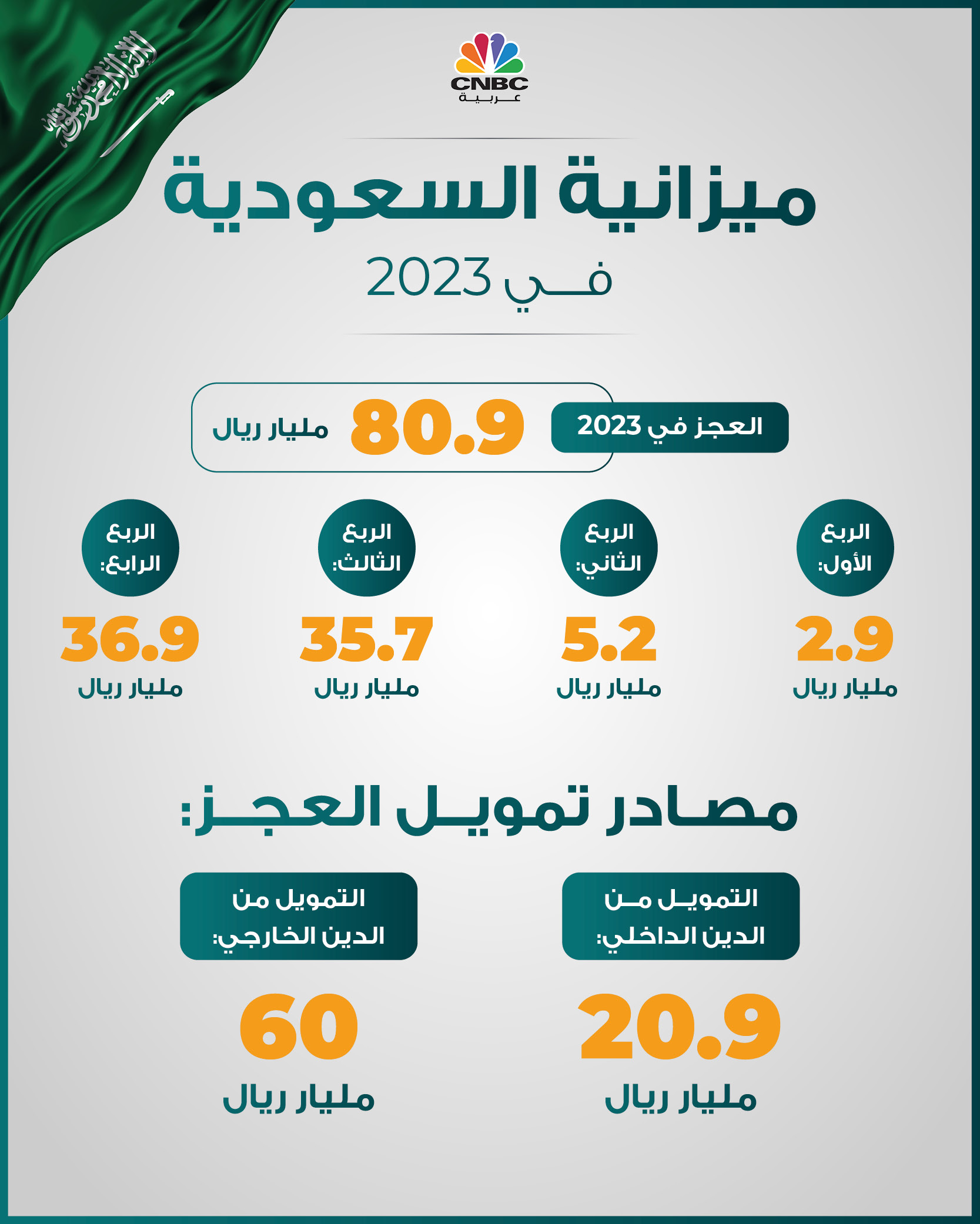 وحقق العجز العام في 2023 ما قيمته 80.9 مليار ريال، حيث جاء في الربع الأول عجز بـ 2.9 مليار ريال، وفي الربع الثاني بلغ 5.2 مليار ريال، وفي الربع الثالث جاء 35.7 مليار ريال، أما الربع الرابع فقد حقق 36.9 مليار ريال.