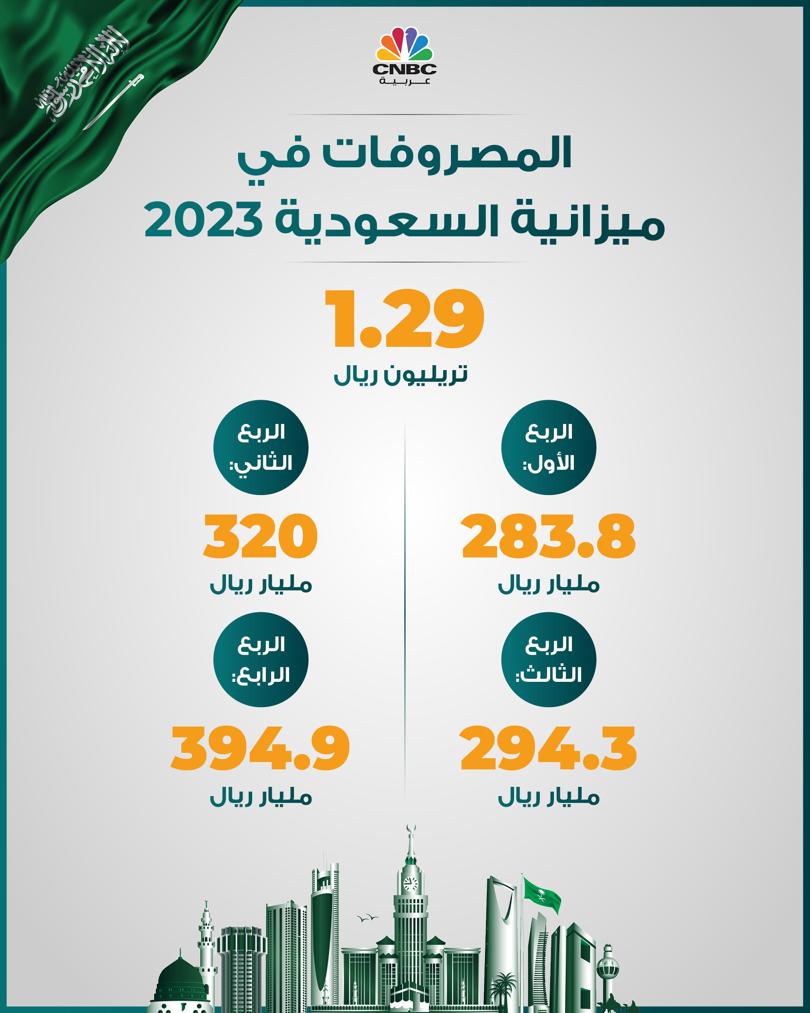 وجاءت المصروفات في ميزانية السعودية 2023 بواقع 1.29 تريليون ريال، حيث جاءت المصروفات في الربع الأول 283.8 مليار ريال، وفي الربع الثاني سجلت 320 مليار ريال