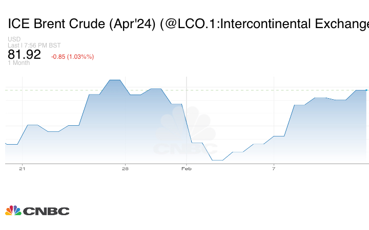 وتم تداول عقد برنت لشهر أبريل/ نيسان عند 81.73 دولاراً للبرميل، بانخفاض 1.04 دولاراً أو 1.26%.