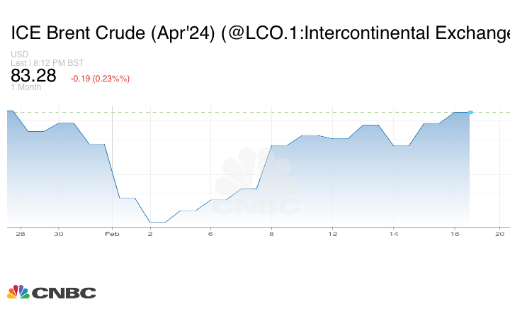 وانخفض سعر العقود الآجلة لخام برنت 58 سنتاً، أو ما يعادل 0.69%، إلى 82.89 دولاراً للبرميل.