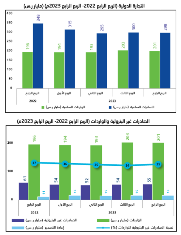 وبالحديث الواردات، فقد ارتفعت في الربع الرابع من العام 2023 بـ 2.8% إلى 201.4 مليار ريال في الربع الرابع 2023 مقابل 196 مليار ريال في الربع المناظر من العام الماضي.