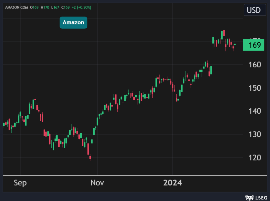 ارتفع أسهم Amazon بنسبة 0.9% في جلسة الأربعاء بعد 3 جلسات متتالية من الانخفاض ، لتضيف الشركة 16 مليار دولار إلى قيمتها السوقية في يوم واحد.