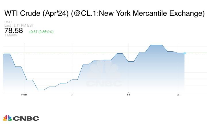 وارتفع نفط غرب تكساس الوسيط لعقد أبريل/ نيسان 67 سنتاً، أو 0.86%، إلى 78.58 دولاراً للبرميل.