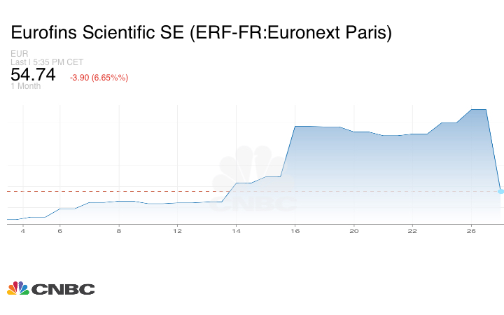 وانخفضت أسهم مجموعة الاختبارات المعملية الفرنسية Eurofins بنسبة 11٪ بعد أن جاءت نتائج العام بأكمله دون التوقعات الخاصة بربحية السهم.