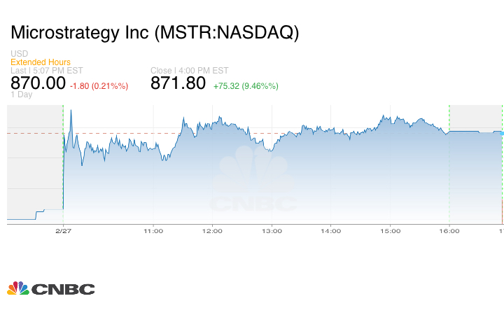 ارتفعت أسهم MicroStrategy بنسبة 16% يوم الاثنين و10% أخرى يوم الثلاثاء لتغلق عند 871.80 دولاراً.