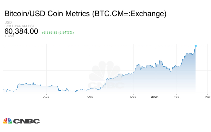 وارتفع سعر العملة المشفرة بنسبة 6% ليصل إلى 60391.10 دولاراً، وفقاً Coin Metrics. وفي وقت سابق، ارتفعت البتكوين إلى 60734.42 دولاراً، ولكنها ما تزال دون أعلى مستوى لها على الإطلاق عندما سجلت 68982.20 دولاراً.