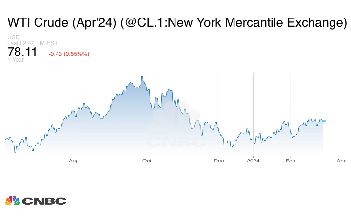 وارتفع نفط غرب تكساس الوسيط لعقد أبريل/ نيسان 7 سنتات، أو 0.09%، ليصل إلى 78.61 دولاراً للبرميل.