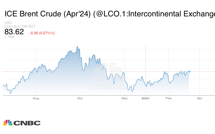 في المقابل انخفضت العقود الآجلة لخام برنت لشهر أبريل/ نيسان بمقدار 5 سنتات أو 0.06% ليصل إلى 83.64 دولاراً للبرميل.