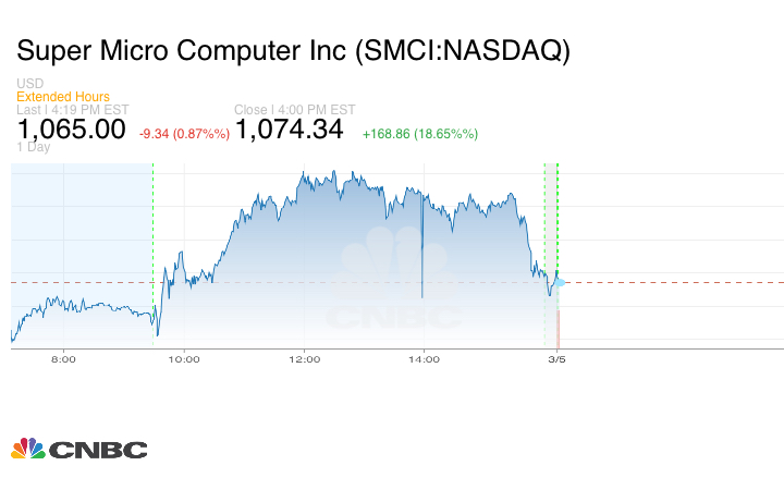 ارتفع سهم شركة Super Micro التكنولوجية أكثر من 25% خلال التعاملات الصباحية من يوم الاثنين، في وول ستريت بعد اختيار الشركة يوم الجمعة الماضي للانضمام إلى مؤشر S&P 500. واختتم التعاملات على ارتفاع قارب 18.65% على سعر 1.074.34 عند الإقفال.