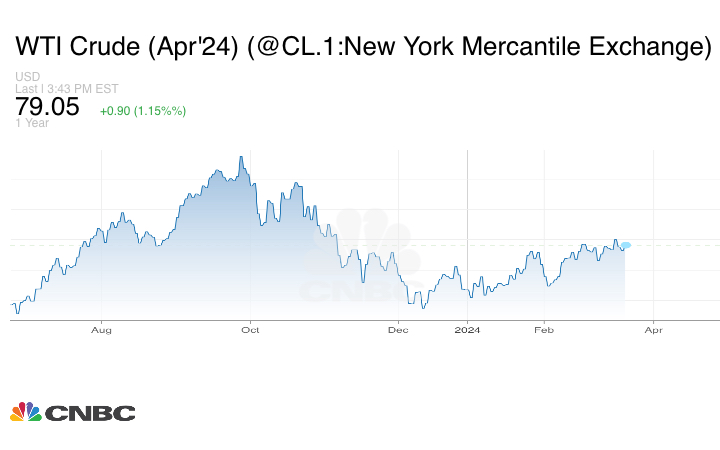 وربح نفط غرب تكساس الوسيط لعقد أبريل/ نيسان 98 سنتاً، أو 1.25%، ليستقر عند 79.13 دولاراً للبرميل.