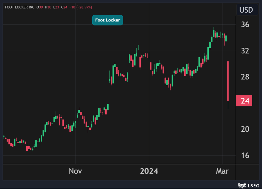 هبط سهم Foot Lockerبنسبة 30% في جلسة الأربعاء مسجلاً أكبر خسارة يومية في أكثر من عامين بعد أن أعلنت الشركة عن خسائر ربعية وتوقعات سلبية لعام 2024.