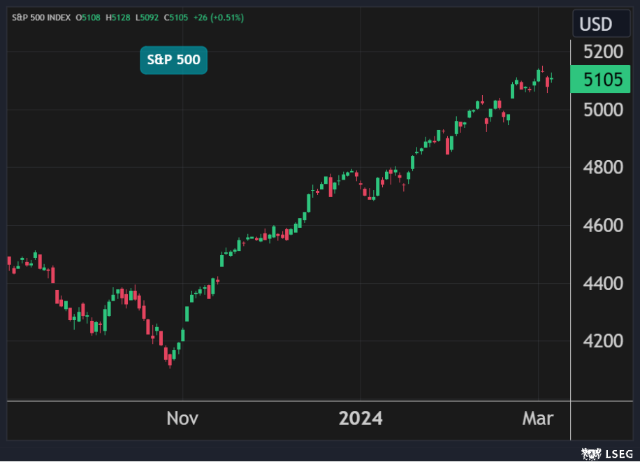 كما ارتفع مؤشر S&P 500 بنسبة 0.5% ليستعيد مستويات 5100 نقطة لتصل مكاسبه إلى 1000 نقطة في آخر 4 أشهر وتحديداَ منذ قاع 27 من أكتوبر الماضي.