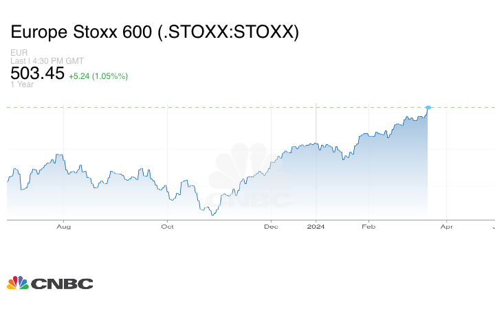 بعد تثبيت البنك المركزي الأوروبي سعر الفائدة وتوقعاته حول التضخم، أغلق مؤشر Stoxx 600 الأوروبي على ارتفاع بنسبة 1.05% عند 503.45 نقطة بعد تجاوز المستوى الرئيسي 500 نقطة للمرة الأولى خلال الجلسة.