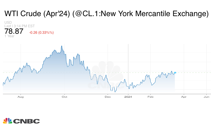 وخسر خام غرب تكساس الوسيط لعقد أبريل/ نيسان 33 سنتاً، أو 0.42%، ليصل إلى 78.80 دولاراً للبرميل.