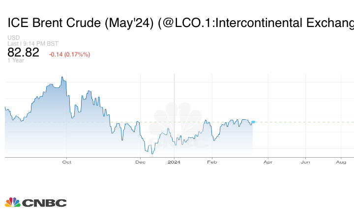 وتراجعت العقود الآجلة لخام برنت في مايو / أيار 32 سنتاً، أو 0.39%، إلى 82.64 دولاراً للبرميل.