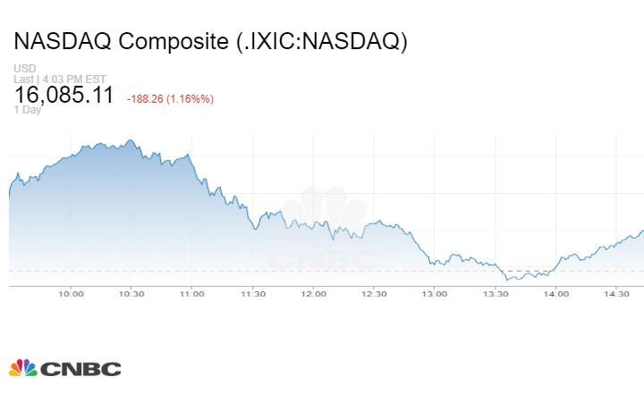 كما هبط مؤشر Nasdaq المركب، الذي تغلب عليه أسهم شركات التكنولوجيا، 188.26 نقطة أو 1.16% إلى 16085.11 نقطة.