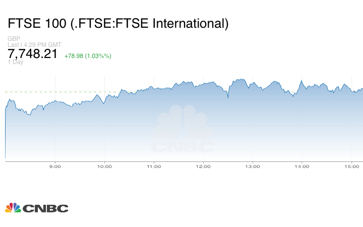وارتفع مؤشر الأسهم القيادية في المملكة المتحدة إلى 7763.72 في الساعة 12:48 مساءً. بتوقيت لندن، وهو أعلى مستوى له منذ مايو/ أيار من العام الماضي، بحسب بيانات Eikon.