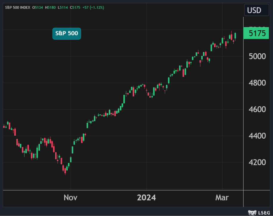 وارتفع مؤشر S&P 500 بنسبة 1.1% مسجلاً ثالث إغلاق قياسي له منذ بداية مارس الحالي بعد أن أغلق فوق 5170 نقطة لأول مرة في تاريخه.