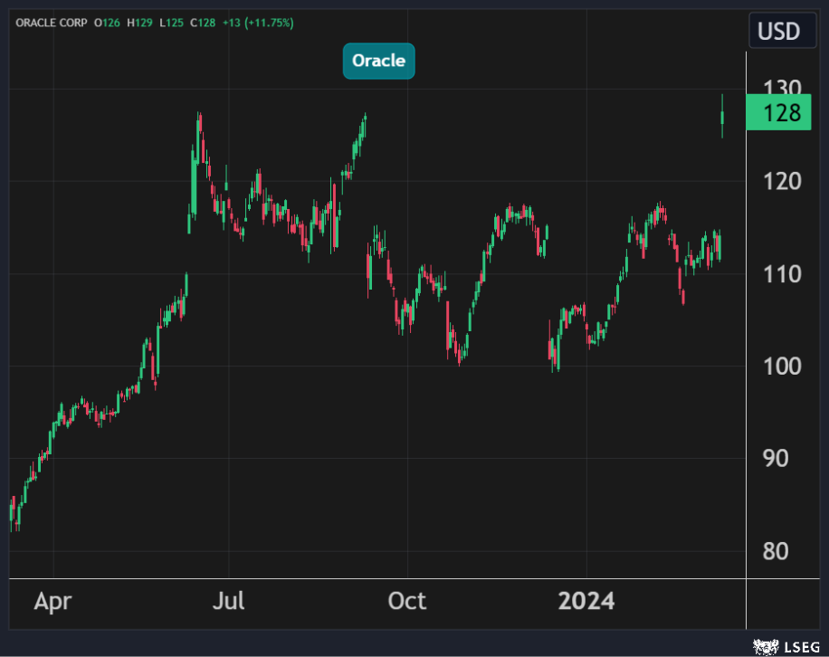 قفز سهم Oracle بنسبة 12% في جلسة الثلاثاء إلى أعلى مستوياته على الإطلاق، لتضيف الشركة 37 مليار دولار إلى قيمتها السوقية في يوم واحد.