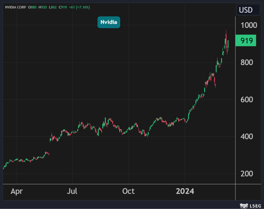 وتتصدر Nvidia المكاسب القوية التي حققتها شركات الرقائق منذ بداية العام الماضي بدعم من الطلب القوي على منتجات الذكاء الاصطناعي.
