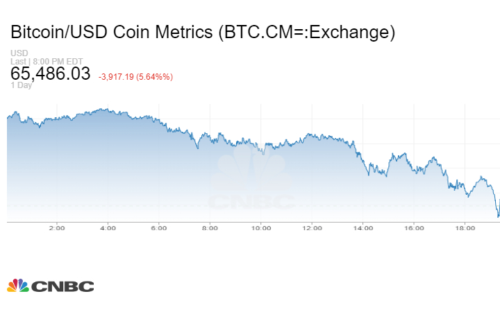 وانخفضت العملة المشفرة بنحو 3917 دولاراً، بنسبة 5.64% خلال آخر 24 ساعة، لتصل إلى 65486 دولاراً في الساعة 04:00 بتوقيت دبي من تعاملات الأحد 17 مارس/ آذار.