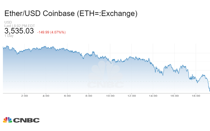 كما انخفضت عملة إيثر المشفرة 150 دولاراً أو بنسبة 4.07% إلى مستوى 3535 دولاراً.