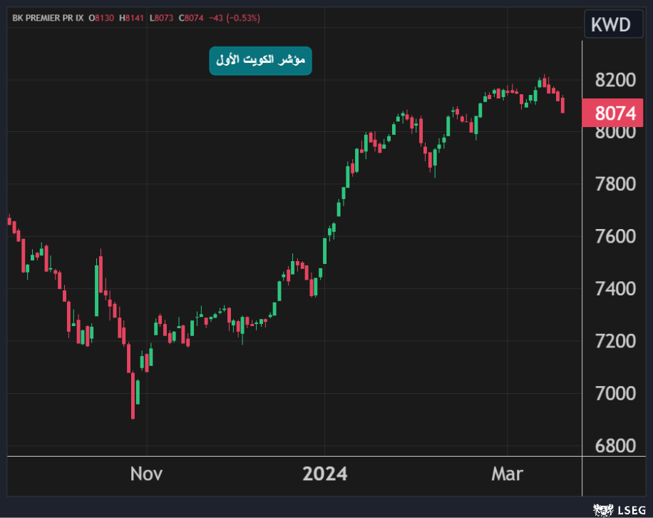 كما تراجع مؤشر الكويت الأول بنسبة 0.5% مسجلاً خامس خسائر يومية على التوالي ليغلق عند أدنى مستوياته في شهر بضغط من انخفاض سهمي بيتك والمباني بنسبة 1% و1.7% على التوالي.