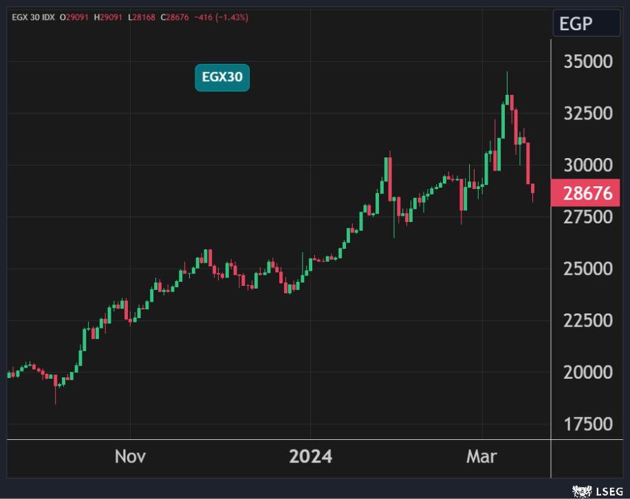 وانخفض المؤشر الثلاثيني بنسبة 1.4% مسجلاً أدنى إغلاق له في 3 أسابيع بضغط من تراجع سهمي التجاري الدولي وطلعت مصطفى بنسبة 3.6% و6.3% على التوالي.