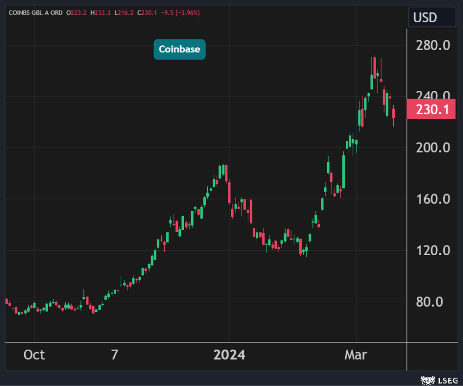 تراجع سهم Coinbase بنحو 4% في جلسة الثلاثاء ليغلق عند أدنى مستوياته في أسبوعين بضغط من انخفاض عملة البتكوين بأكثر من 5% لتفقد مستويات 64 ألف دولار في اليوم ذاته.