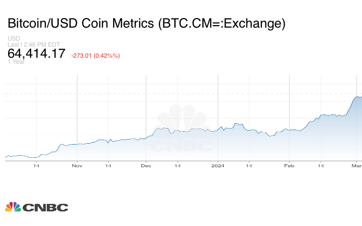 وانخفضت عملة البيتكوين بنسبة 12% في الأسبوع الماضي، بعد أن سجلت أعلى مستوى لها على الإطلاق عند 73797.68 دولارًا يوم الخميس الماضي. لا يزال مرتفعًا بنسبة 50% تقريباً لهذا العام.