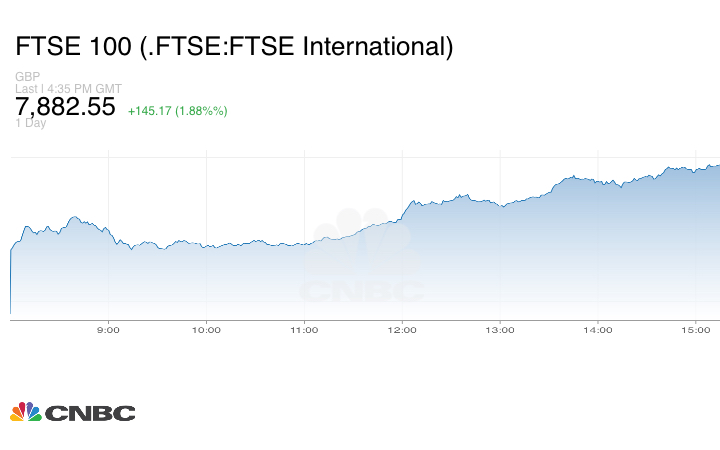 وأنهى مؤشر FTSE 100 في لندن الجلسة مرتفعاً بنسبة 1.8%. وكانت هذه أفضل جلسة لمؤشر FTSE منذ سبتمبر/ أيلول من العام الماضي. فيما انخفض الجنيه الاسترليني مقابل الدولار الأميركي وانخفضت عائدات السندات الحكومية البريطانية.