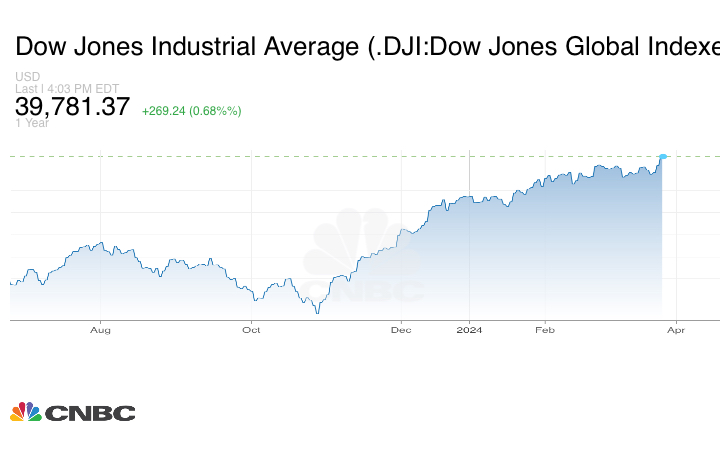 وصعد مؤشر الداو جونز بنسبة 0.7% أي ما يعادل 270 نقطة، ليغلق فوق مستويات 39700 نقطة لأول مرة في تاريخه،