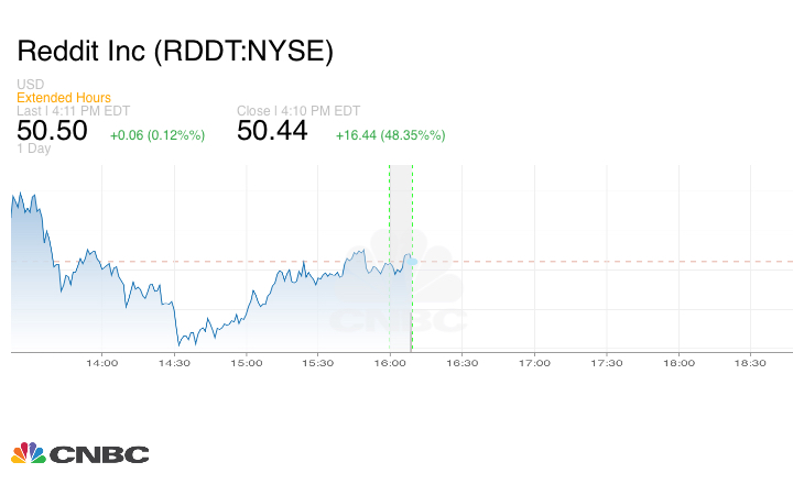 وارتفعت أسهم شركة التواصل الاجتماعي Reddit أكثر من 40% فوق سعر طرحها العام الأولي في أول ظهور لها في السوق.