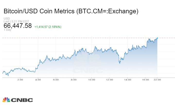 صعدت عملة بتكوين المشفرة بنسبة تجاوزت 2% خلال تعاملات الأحد 24 مارس/ آذار، لكنها فشلت في كسر الـ 68 ألف دولار حتى الآن، وتحوم حول مستويات الـ 66 ألف دولار.