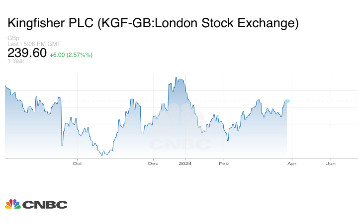 مجموعة Kingfisher لصيانة وتطوير المنازل والمالكة لعلامات تجارية مثل B&Q وScrewfix، انتعشت في صفقات بعد الظهر لتغلق على ارتفاع بنسبة 2.5%. وانخفض السهم في وقت سابق من الجلسة بعد إصدار تقرير ثالث بشأن الأرباح في ستة أشهر.
