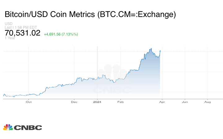 ارتفعت رائدة العملات المشفرة بتكوين لتبدأ الأسبوع الأخير من شهر مارس/ آذار بقوة، مستعيدةً مستوى 70 ألف دولار.