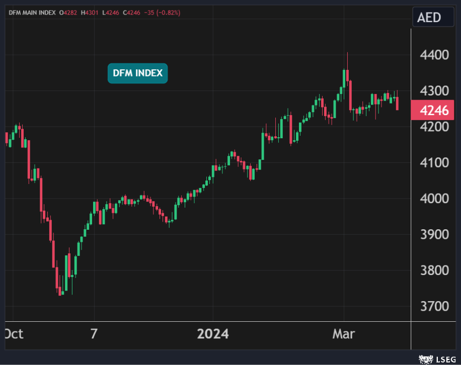 كما تراجع مؤشر سوق دبي بنسبة 0.8% مسجلاً أكبر خسارة يومية في 3 أسابيع بضغط من انخفاض سهمي إعمار العقارية ودبي الإسلامي بنسبة 1.5% و1.2% على التوالي.