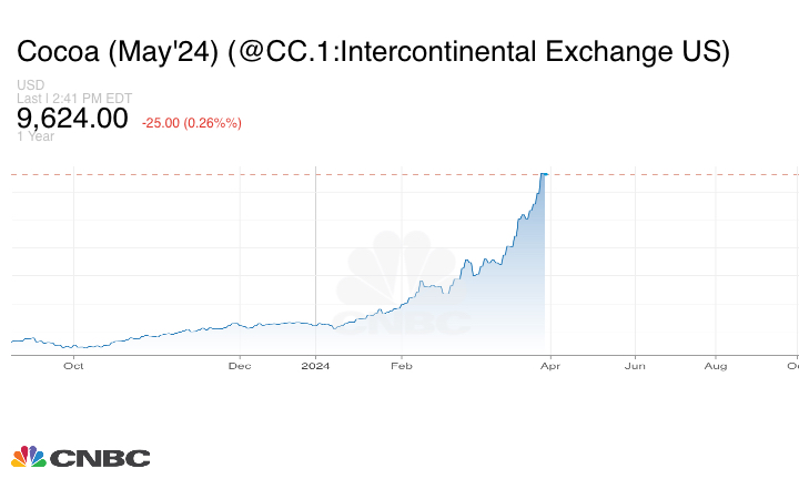 منذ بداية العام، قفزت أسعار الكاكاو بأكثر من الضعف نتيجة عوامل مناخية أدت إلى تراجع المحصول، إضافةً إلى زيادة الآفات التي استهدفت أشجار الكاكاو، بالتزامن مع ارتفاع تكاليف المبيدات والأسمدة.