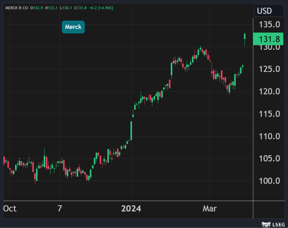 قفز سهم Merck بنسبة 5% في جلسة الأربعاء ليغلق عند أعلى مستوياته على الإطلاق، لتضيف الشركة 16 مليار دولار إلى قيمتها السوقية في يوم واحد