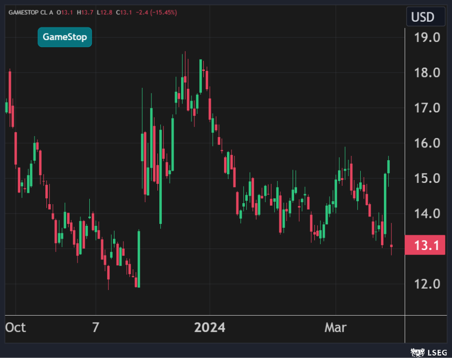 هبط سهم GameStop بأكثر من 15% في يوم الأربعاء ليتكبد أكبر خسارة يومية في نحو 9 أشهر.